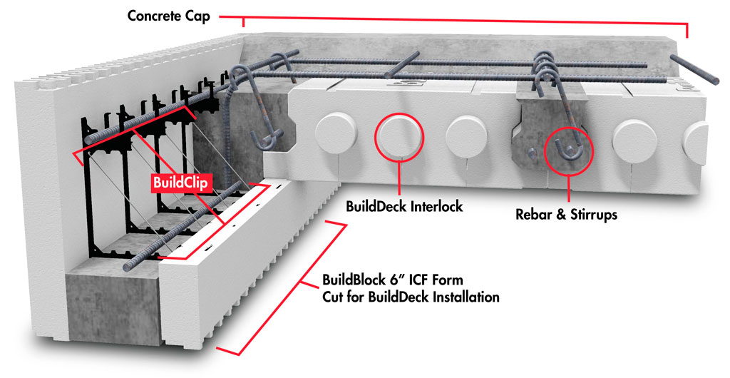 Installing BuildDeck or other ICF decking often requires cutting the inside of the ICF block in half to allow a monolithic concrete cap to join seamlessly with the ICF wall. The BuildBlock ICF is designed with attachment locations for BuildClip to attach diagonally and restore missing web strength from the half height block cut.